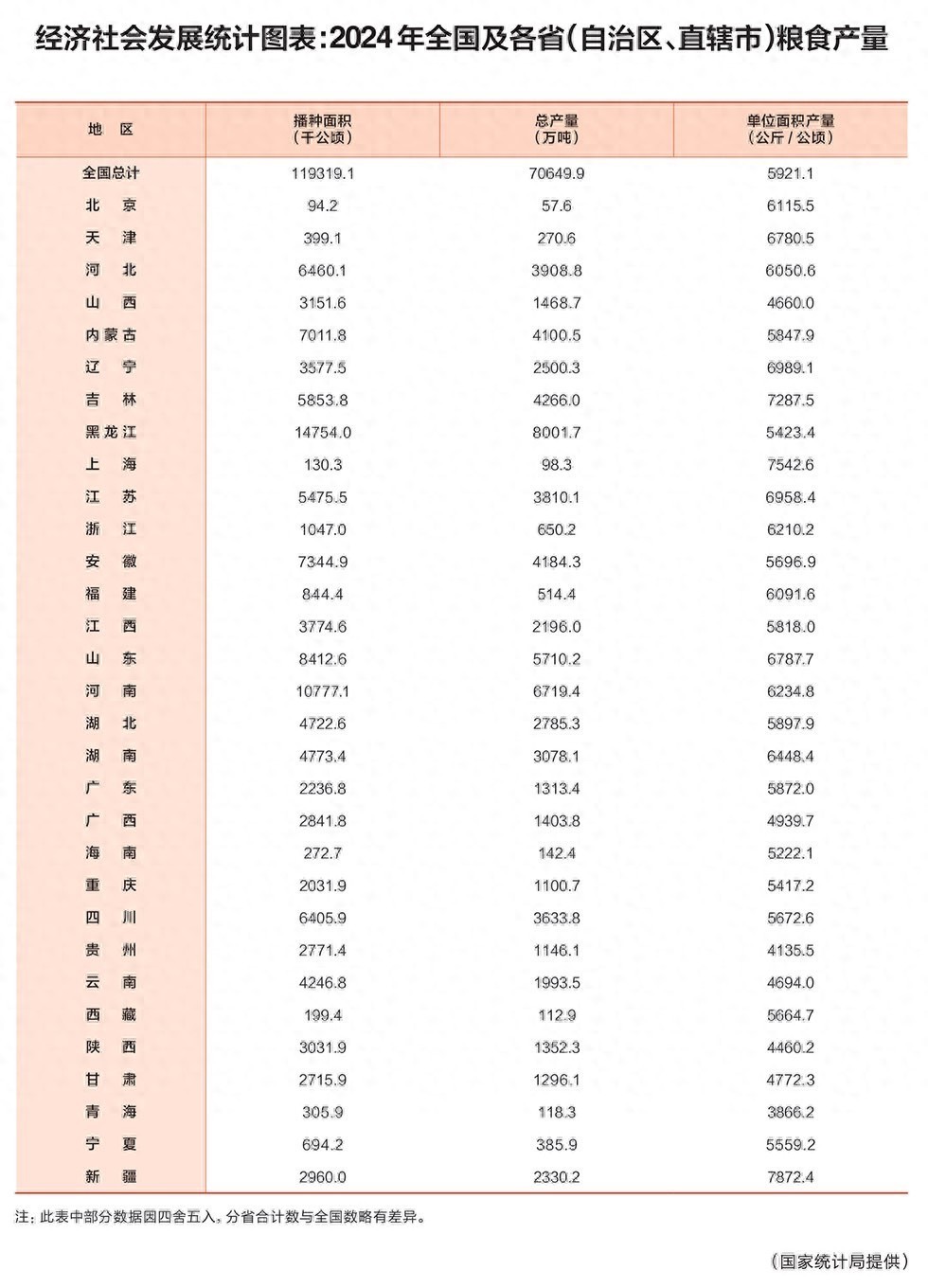 经济社会发展统计图表:2024年全国及各省(自治区、直辖市)粮食产量